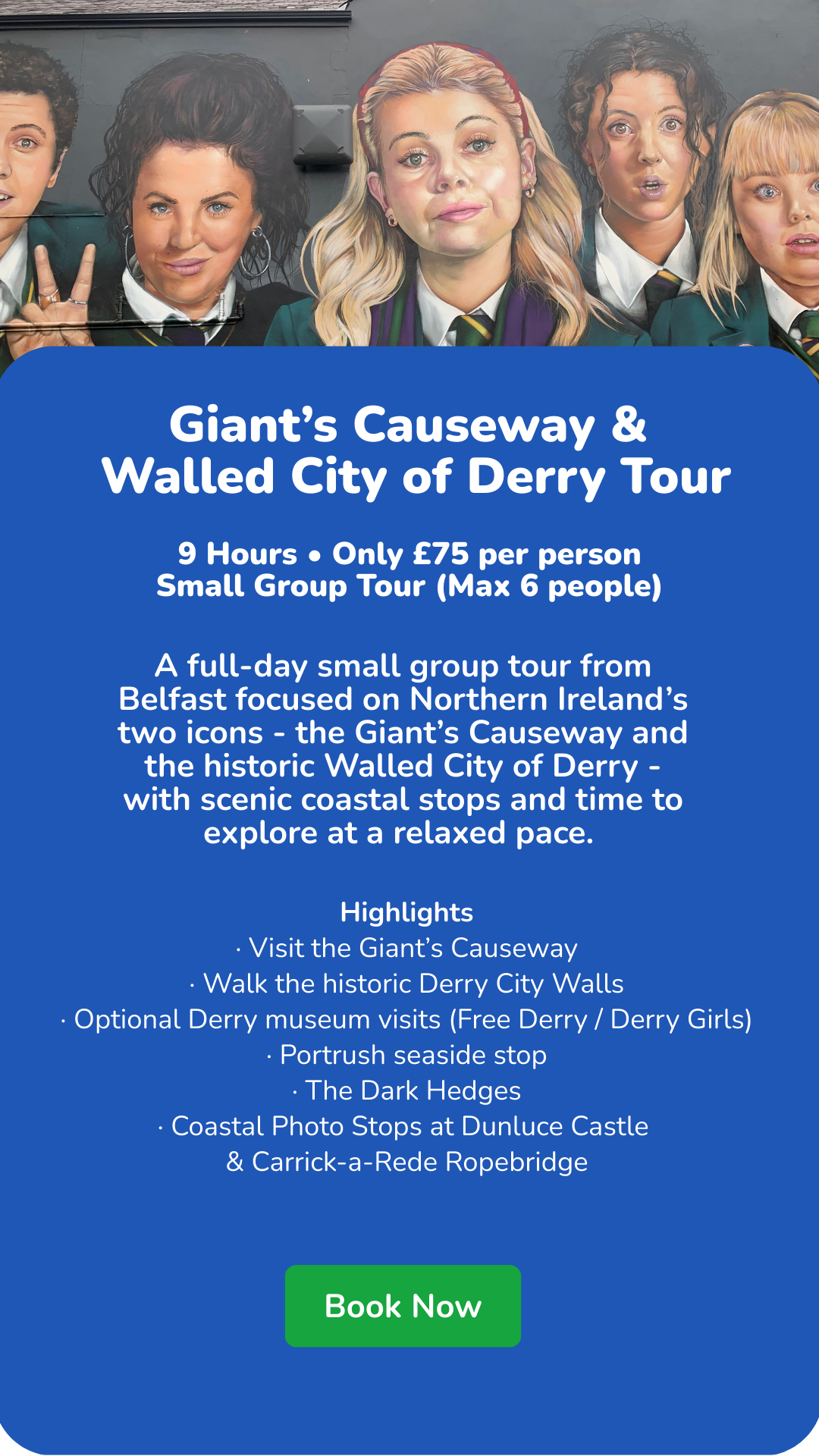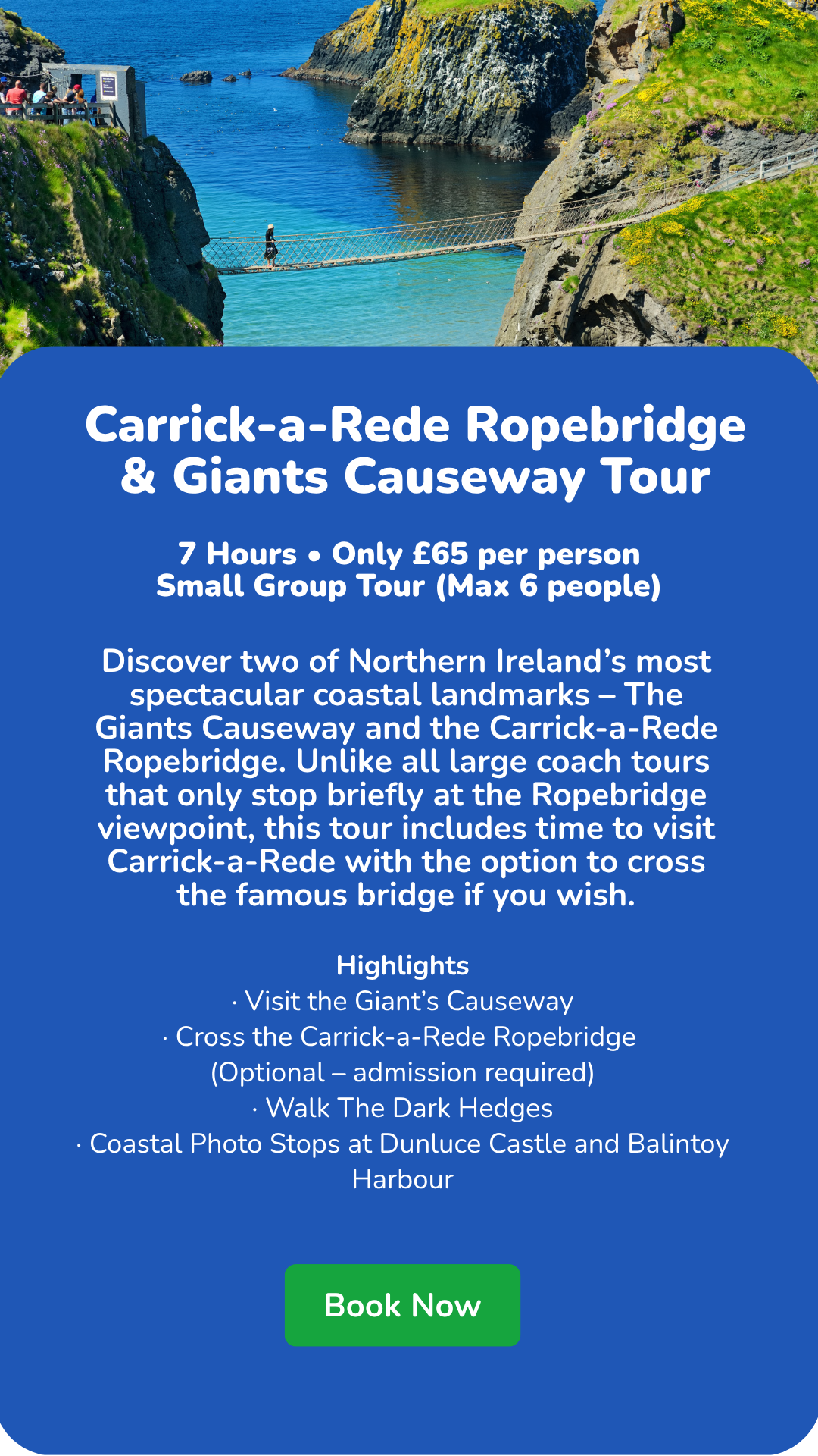Small group experience (maximum 6 guests) • Pickup from central Belfast • Local driver-guide • Available on selected summer departure dates only